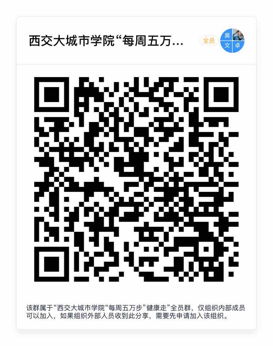 参加人员需使用“钉钉”扫描此通知下方二维码加入“西交大城市学院‘每周五万步’健步走”群组,并在钉钉页面内打开“钉钉运动”点击“参与群排行”,同时保证手机定位功能打开,以确保活动顺利进行。