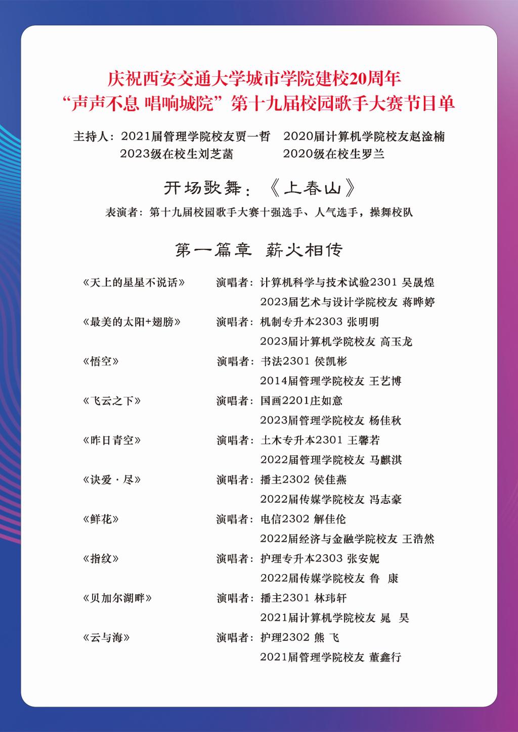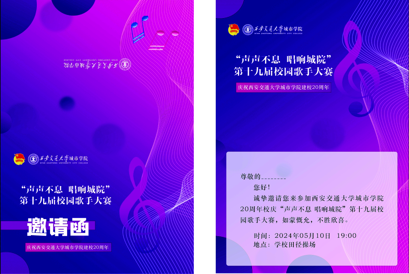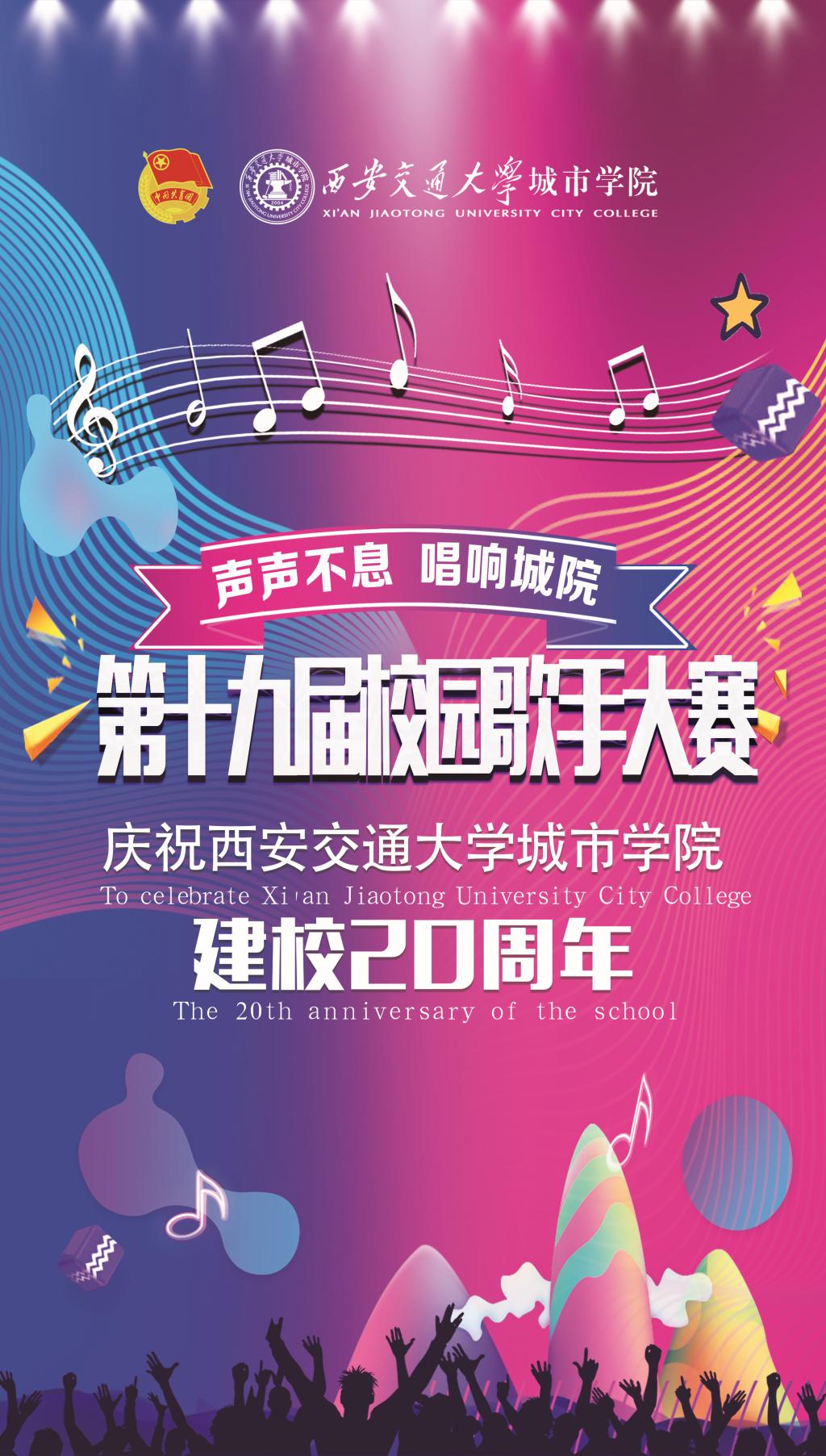 为庆祝西安交通大学城市学院建校20周年,学校将于2024年5月10日晚19:00将在校田径操场举办“声声不息 唱响城院”第十九届校园歌手大赛。