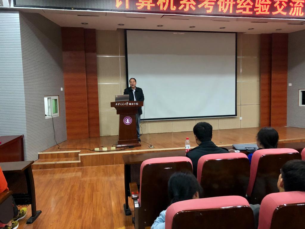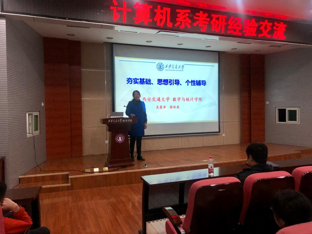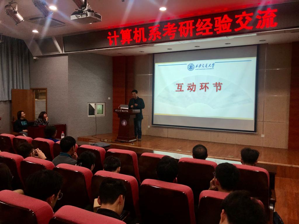 会议第三项由西安交通大学数学学院杨改英教授、外国语学院赵亚军教授分别从坚定考研信念、题型及试题特点、复习计划指导等方面向参会学生进行讲解,两位教授的精彩讲解赢得了在场学生的阵阵掌声。最后,系学生工作负责人刘敏涛向全体学生通报了计算机系近期针对考研已经实施的几项工作内容,分别是全系考研学生情况精确摸底、考研学生组织与跟进工作、系内考研自习室安排情况、考研经验交流安排、校内外考研资源争取与协调等服务性工作。