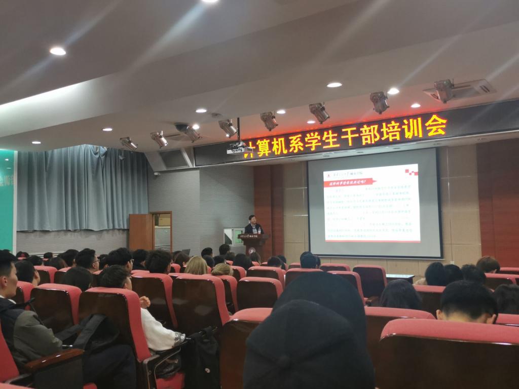 为进一步提高学生干部的工作能力与水平,计算机系于11月10日晚在教学楼F100组织举行计算机系学生干部培训第二讲,学院学生服务中心副主任辛红伟担任主讲人。计算机系学工办全体辅导员与2019级、2020级全体学生干部参加培训会,培训会由计算机系学生工作主管刘敏涛主持。