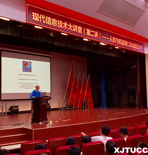 9月20日晚,西安交大城市学院计算机系在教二报告厅举办“现代信息技术大讲堂”第二讲,西安交通大学教授、博士生导师、陕西省“百人计划”特聘教授陈霸东作题为《人脑与机器接口及读脑技术》的报告。系主任缪相林教授与2017级、2018级学生参会,系学生工作主管刘敏涛主持报告会。
