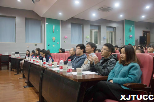 本次演讲比赛由刘方舟和赵凎楠同学主持,在一段精彩的开场舞表演过后,本场演讲比赛正式拉开帷幕。主持人介绍了此次演讲比赛的评委老师,并向大家宣读了比赛规则及评分标准。比赛第一环节七位参赛选手依次进行了形式多样的自我介绍与才艺展示,吉他弹唱、深情朗诵、相声互动赢得了同学们热烈的鼓掌及欢呼。本次演讲比赛还开通了微信公众投票平台,同学们可以为自己喜欢的选手投票。接着是来自几个不同省份的同学带来了的串场节目——“三句半”,夸张烦人表演形式引得同学们捧腹大笑。比赛第二环节由评委老师抽签决定选手的演讲顺序,选手们通过精美的PPT向评委介绍了别人眼中不一样的家乡,让大家了解到祖国的美景美食、名人古迹等。最后由主持人赵凎楠等同学带来的吉他弹唱将现场的气氛带入了高潮。