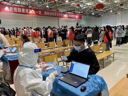 “请佩戴口罩。”“请打开西安一码通,提前扫码入场。”“请有序进场,注意一米间隔……”伴随着广播台学生亲切温馨的声声提醒,10月19日,西安交通大学城市学院为全体师生开展核酸检测工作。此次检测现场设置在大学生活动中心,检测工作由专业核酸检测机构负责采样。全体师生有序排队,全程佩戴口罩,保持一米安全距离,分时分段、错峰进行核酸检测,巩固防疫屏障。在医务工作者和学生志愿者的全力以赴下,在学院各相关部门的通力配合下,核酸检测工作高效有序进行,从下午14时到晚间23时顺利完成了9691名师生的核酸检测采样工作,展现了城院速度,更为学院教育教学的有序开展和坚决打赢疫情防控阻击战打下了坚实基础。