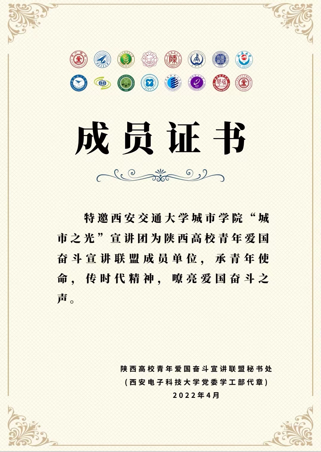 陕西高校爱国奋斗宣讲联盟为学院“城市之光”学生宣讲团颁发联盟新成员单位证书,作为联盟新成员,“城市之光”学生宣讲团定能做到承青年使命,传时代精神,嘹亮爱国奋斗之声。