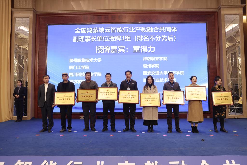 11月11日,全国鸿蒙端云智能行业产教融合共同体成立大会在潍坊举行。共同体由工业和信息化部教育与考试中心指导,华为云计算技术有限公司、贵州大学、山东科技职业学院共同牵头,联合250余家行业龙头企业、普通高校、职业院校、科研机构、行业协会和上下游企业共同发起建设。共同体常务副理事长单位47家,副理事长单位40家,常务理事单位44家,理事单位39家,会员单位79家。西安交通大学城市学院当选为共同体副理事长单位,朱旭副院长当选为共同体副理事长。