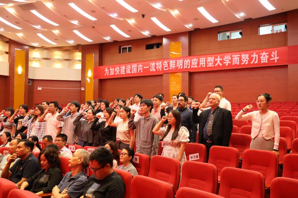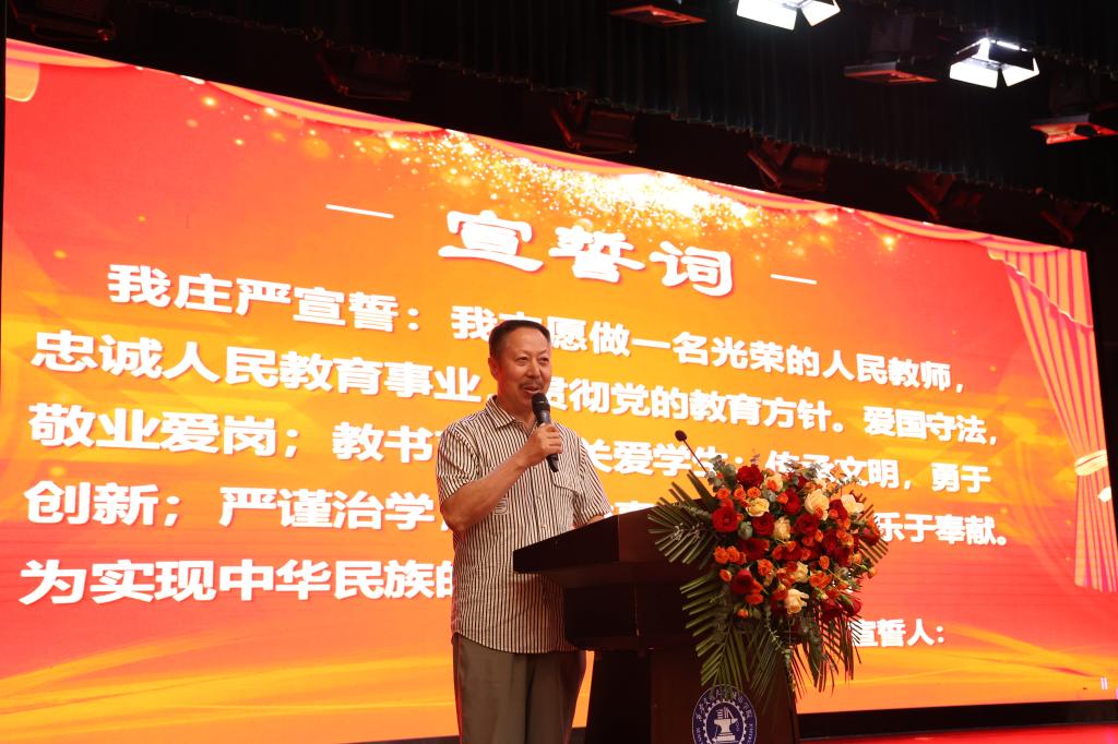 会上,教授会主席解安宁教授领誓,全体新入职教师右手握拳宣誓,做出庄严的师德承诺:“我志愿做一名光荣的人民教师,忠诚人民教育事业,贯彻党的教育方针。爱国守法,敬业爱岗;教书育人,关爱学生;传承文明,勇于创新;严谨治学,启智求真;为人师表,乐于奉献。为实现中华民族的伟大复兴而努力奋斗!”