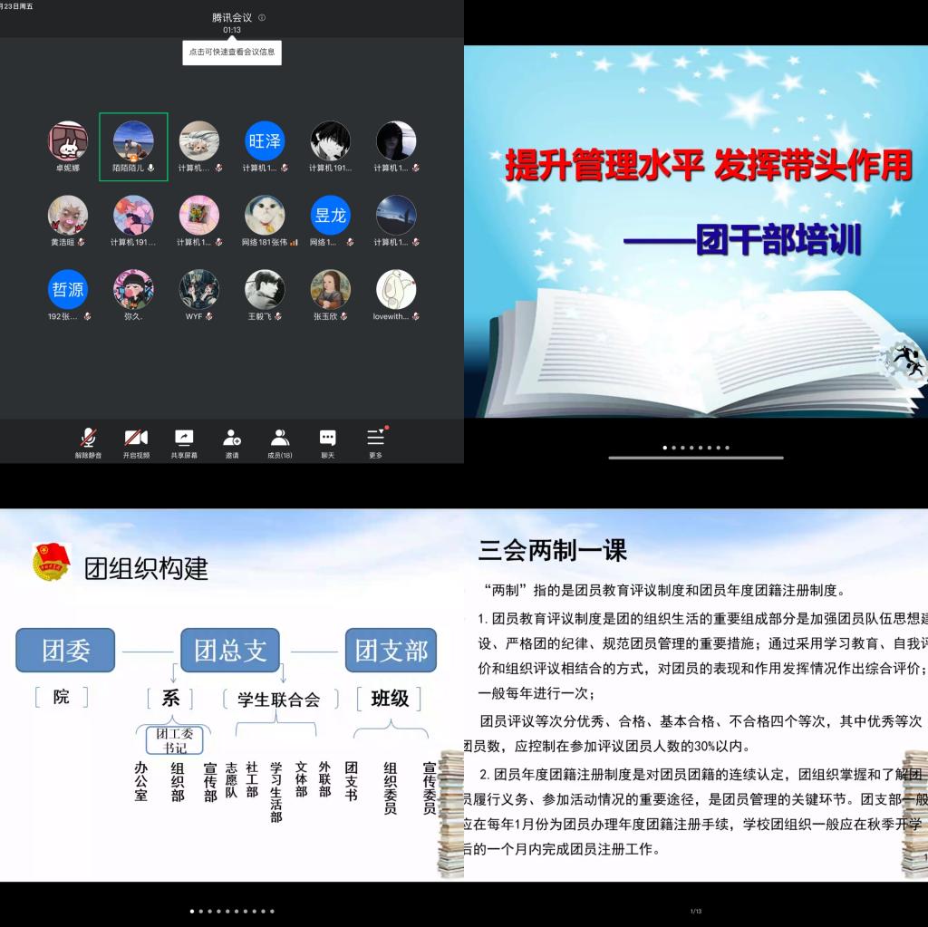 为充分调动广大团员青年的积极性,号召先进青年为抗击疫情发挥主人翁精神,贯彻落实习近平新时代中国特色社会主义思想,以更好的状态迎接十四运,西安交通大学城市学院计算机系团总支开展“疫情防控齐努力•创文创优争先锋”为期一个月的主题团日活动,并于10月24日晚线上开展团课基础理论培训暨主题团日活动总结会,至此,计算机系主题团日活动圆满结束。