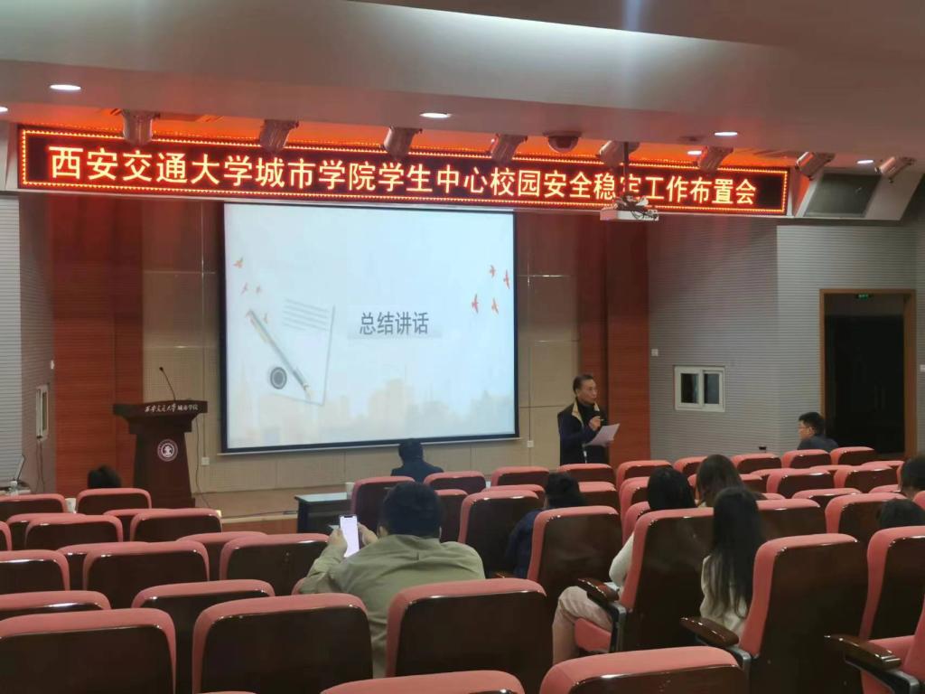 4月28日,西安交通大学城市学院学生中心校园安全稳定工作布置会在F100举行。院长助理兼学生服务中心主任张学堂,学生服务中心常务副主任辛红伟及相关学生工作者参加了本次会议。